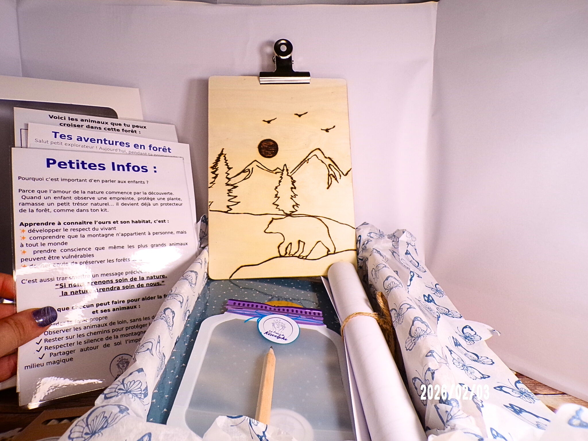 Sur un support en bois pyrogravé à la main, prêt à être emporté en forêt, vous trouverez :