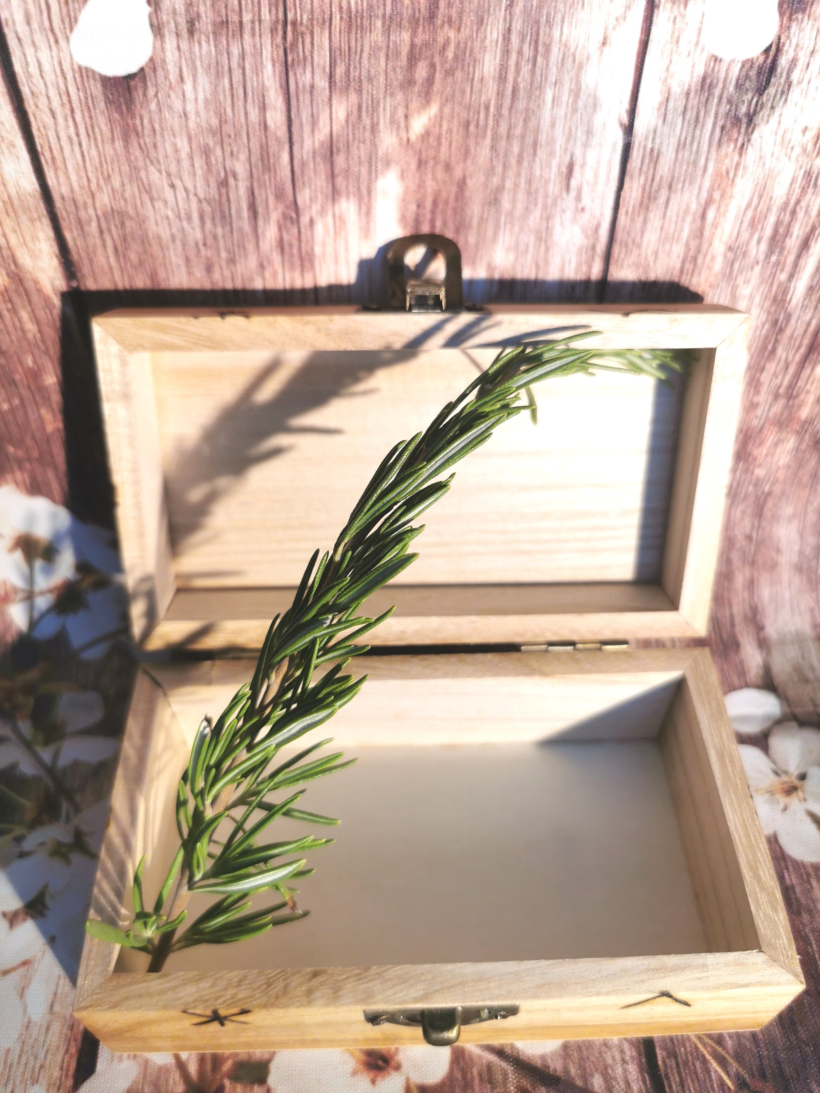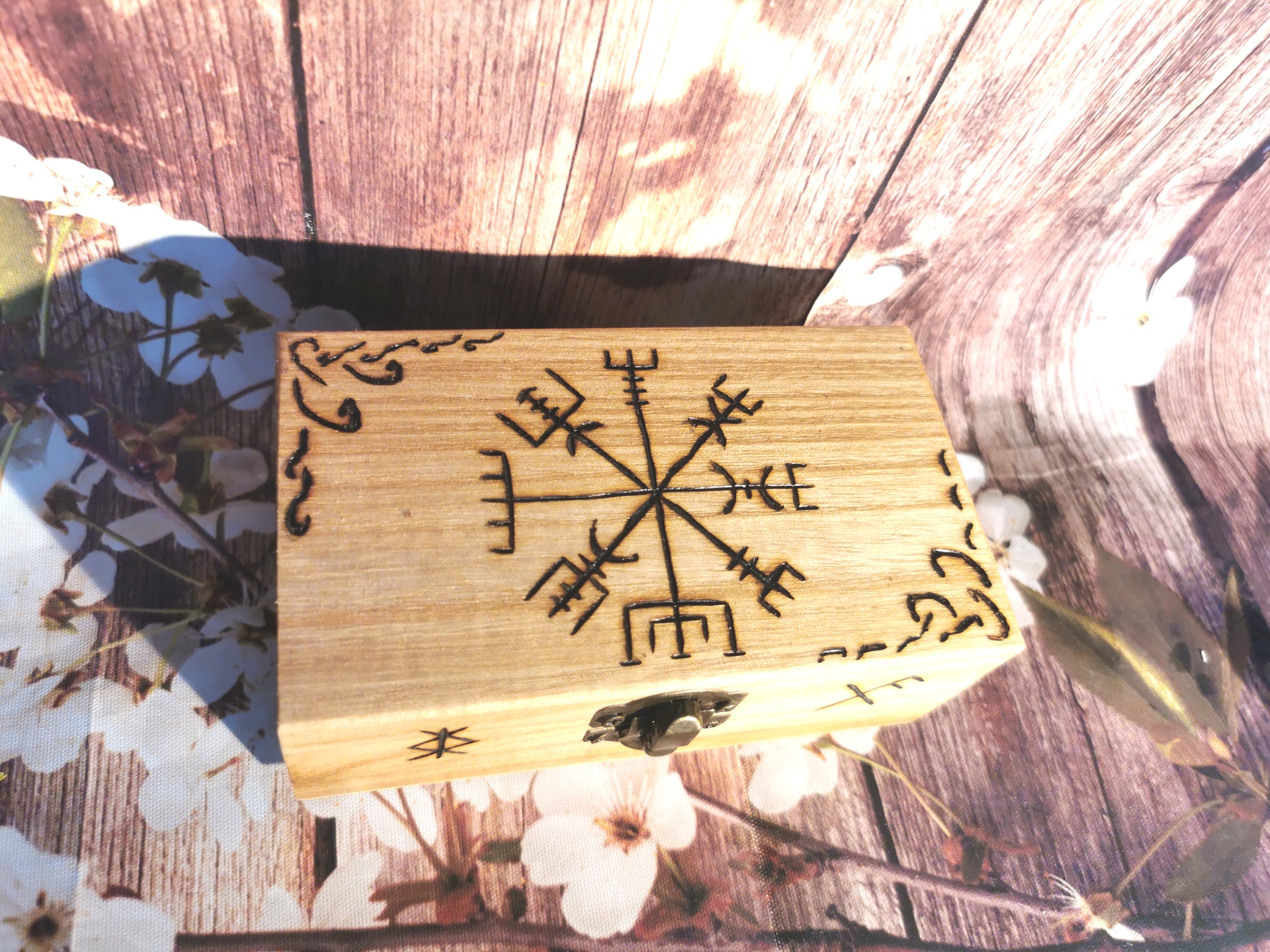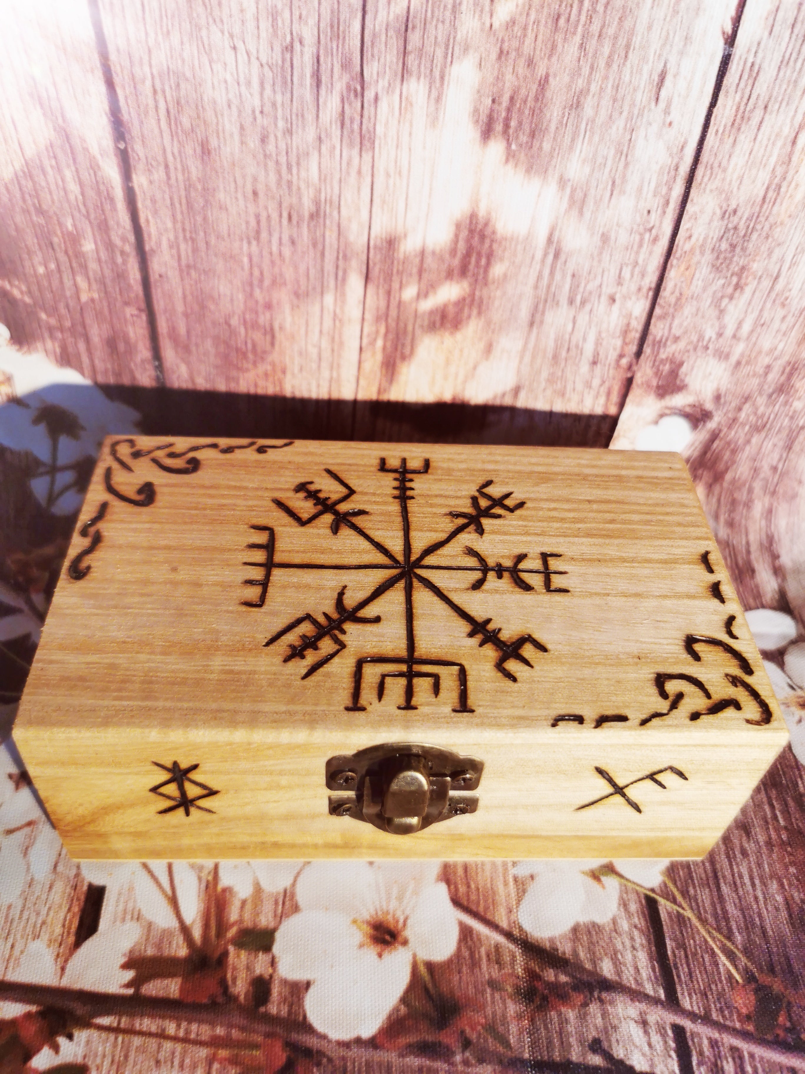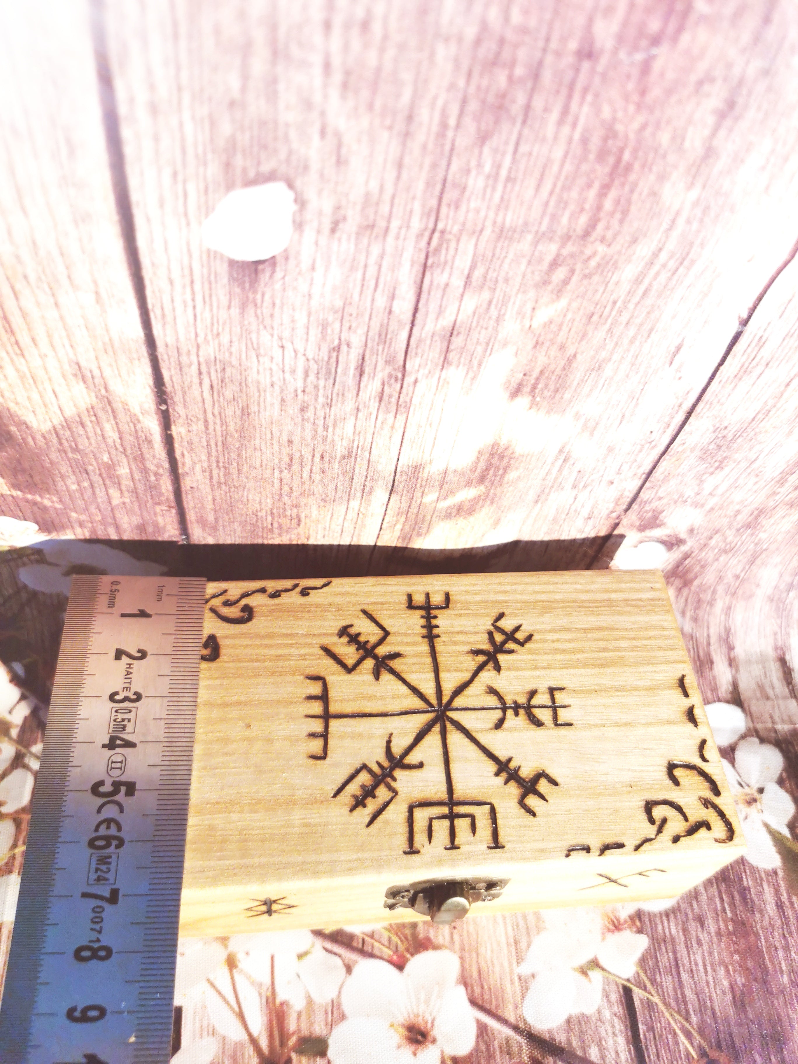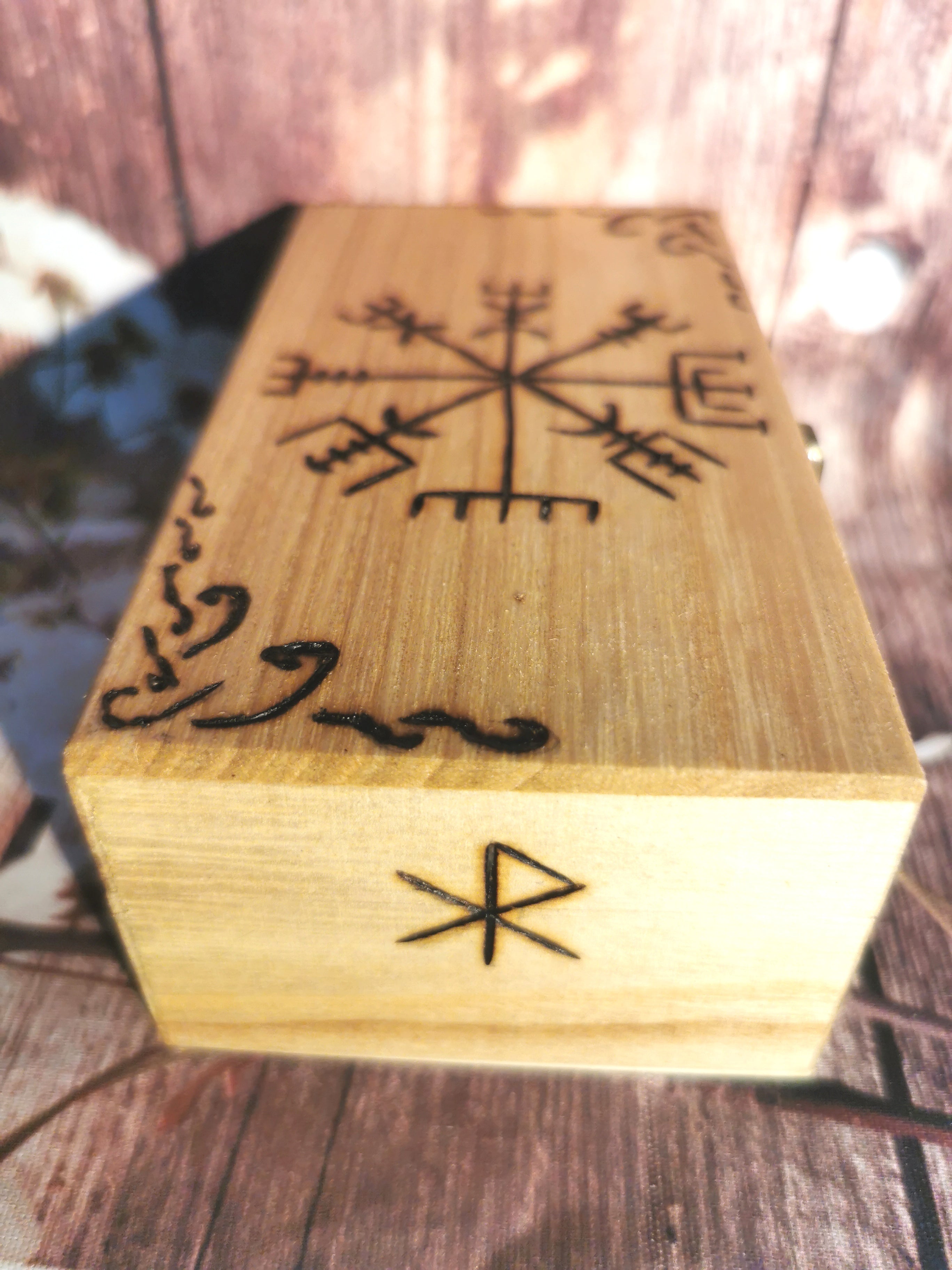 - Coffret en bois naturel pyrogravé avec runes de protection (travail artisanal, chaque pièce est unique).